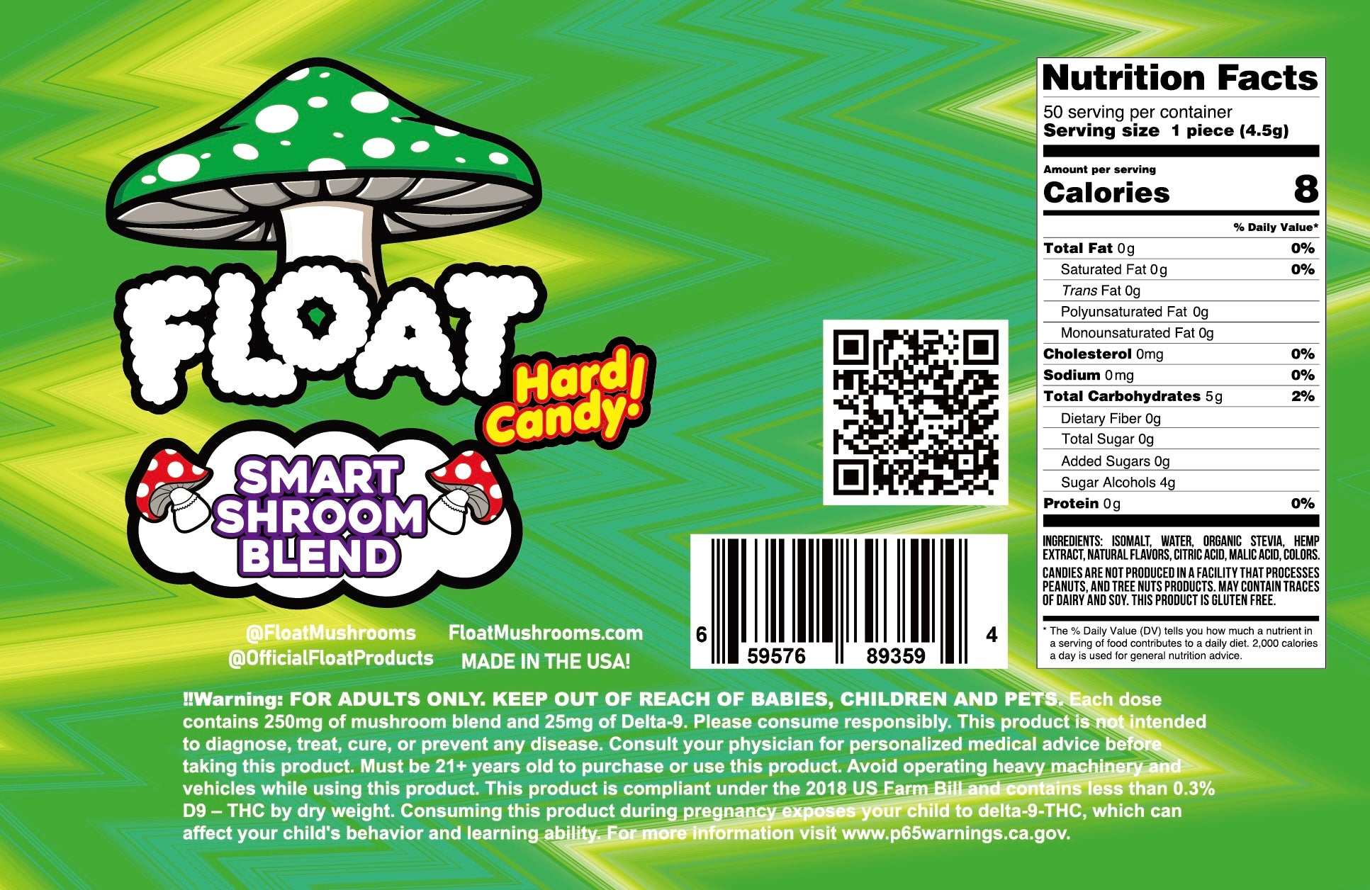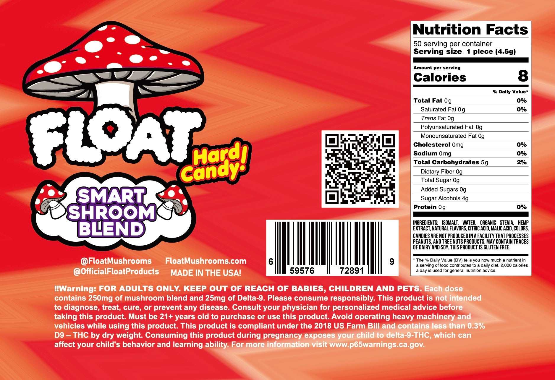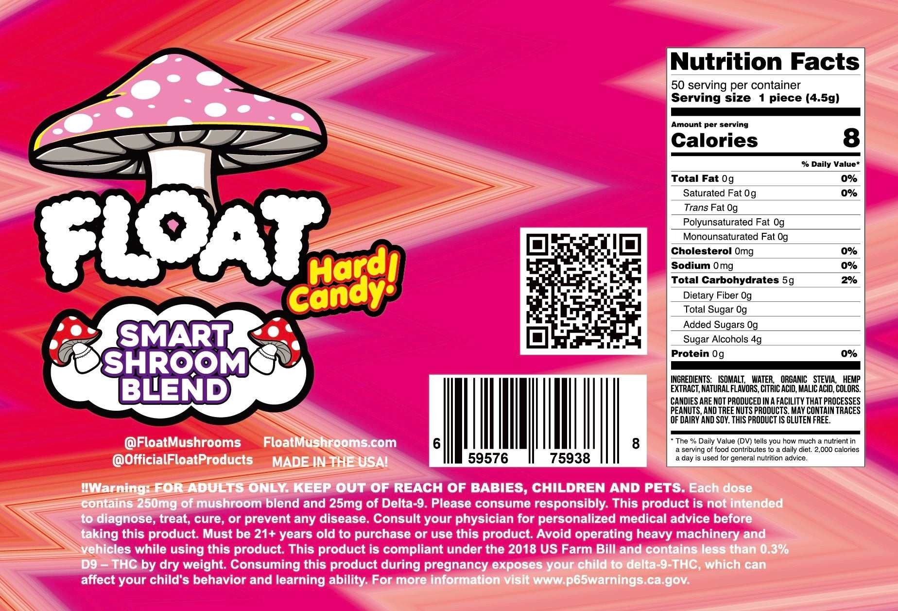 FLOAT Mushrooms™ Hard Candies are designed to support memory, focus, immune function, energy, and overall cognitive wellness. Hemp-derived Delta-9 THC primarily binds to CB1 receptors in the brain and central nervous system, producing the characteristic euphoric sensation.