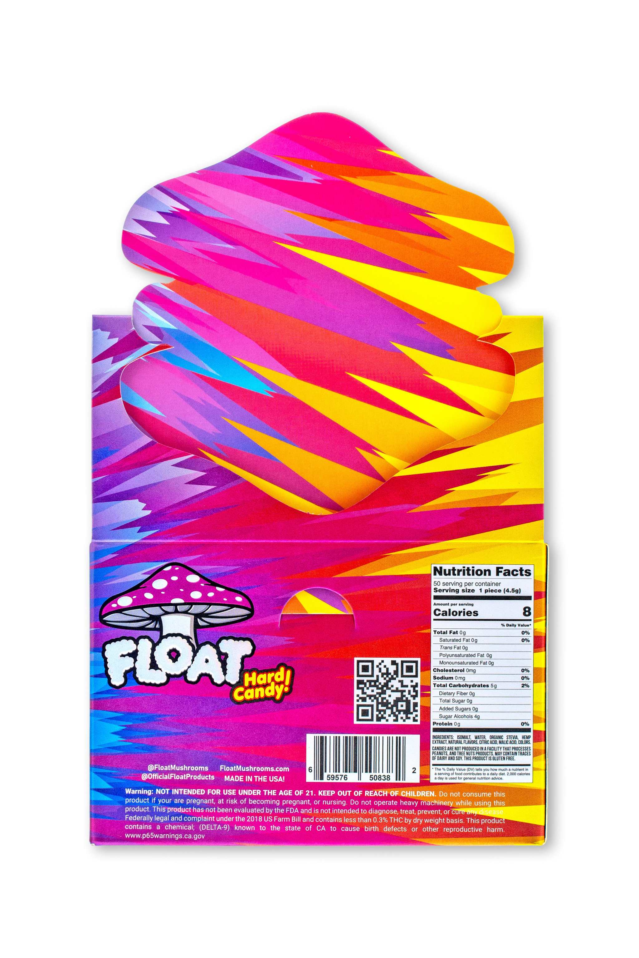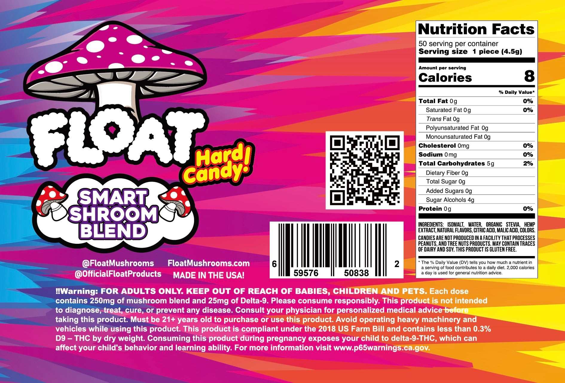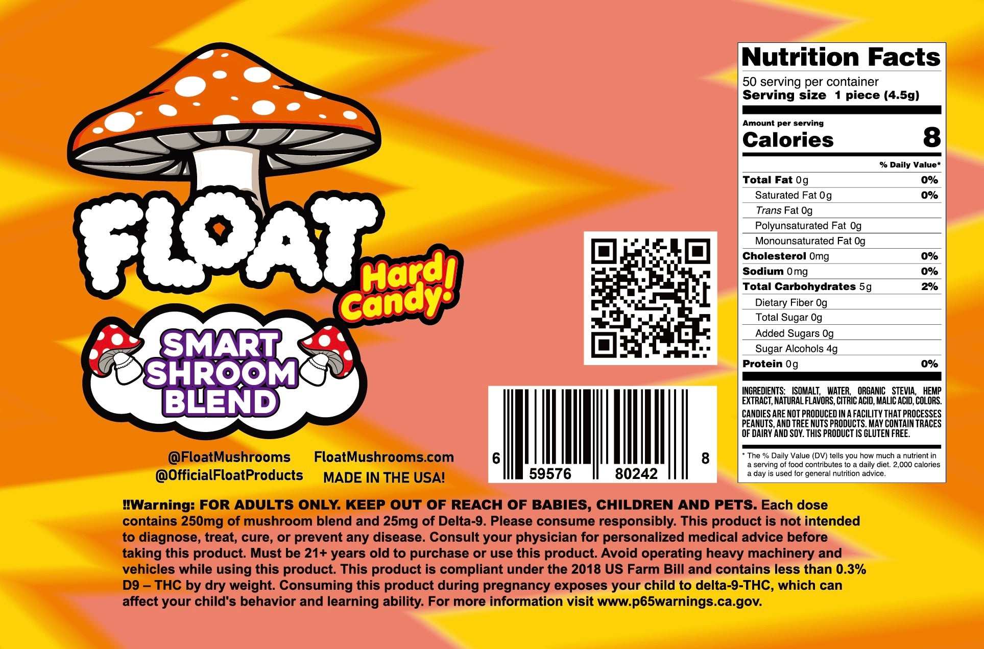 FLOAT Mushrooms™ Hard Candies are designed to support memory, focus, immune function, energy, and overall cognitive wellness. Hemp-derived Delta-9 THC primarily binds to CB1 receptors in the brain and central nervous system, producing the characteristic euphoric sensation.